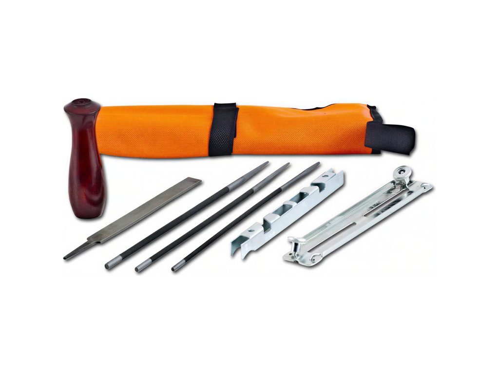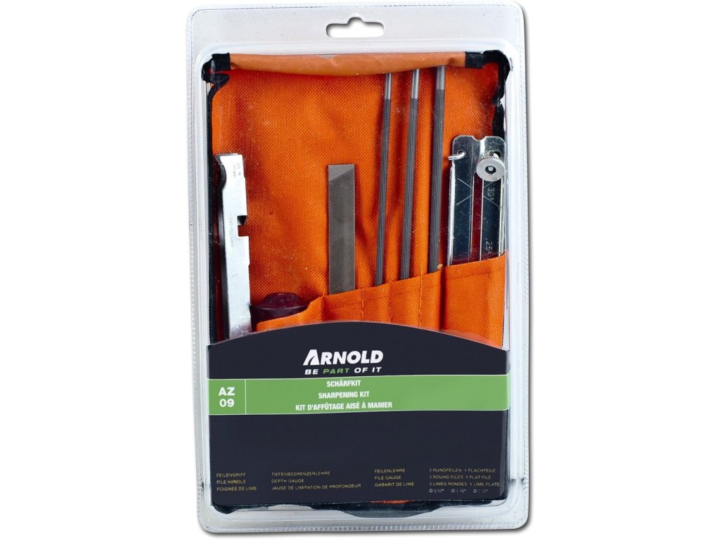 Univerzální sada pro broušení pilových řetězů a srážení omezovacích zubů Arnold v praktické rolovací brašně.Sada obsahuje: