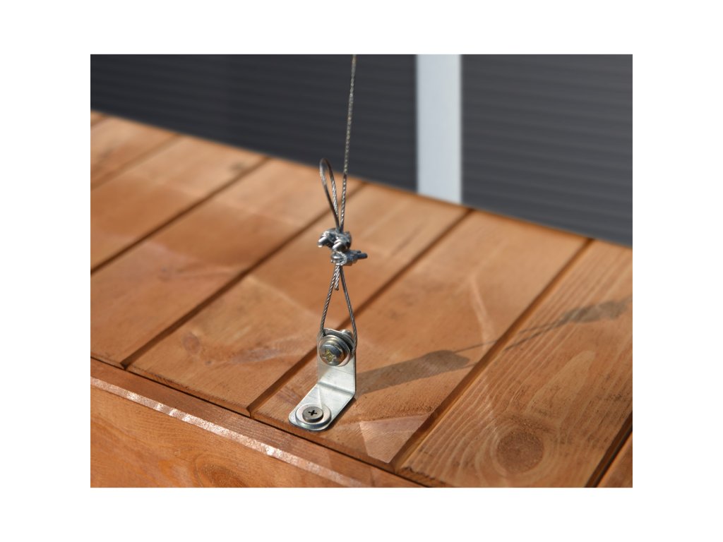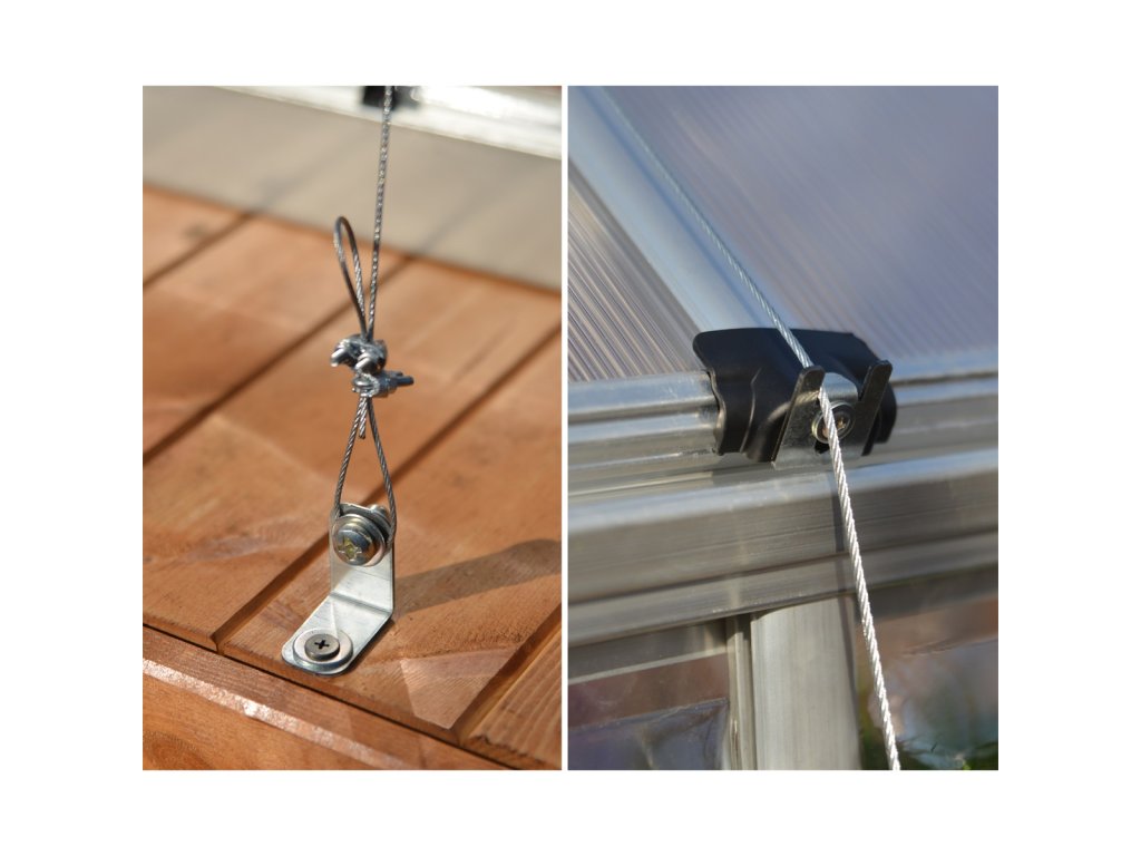 Kotvící systémKotvící set obsahuje vše pro ukotvení vašeho skleníku k pevným základům nebo přímo do půdy. Ukotvit skleník můžete samozřejmě všemi obvyklými způsoby. Základna skleníků Palram to bez problémů umožňuje. Originální kotvící set Palram je možnost, jak skleník ukotvit rychle a bezpečně a jak ho spolehlivě ochránit i před silným větrem. Dá se rovněž použít v kombinaci s jiným způsobem ukotvení (např. přišroubování základny na betonové patky) jako dodatečná ochrana při očekávání vichřice apod. Výhodou je, že ukotvení skleníku zvládne každý během několika minut. Pro ukotvení k pevné podložce slouží kotevní "V" profily se šrouby a hmoždinkami, pro ukotvení do půdy slouží kolíky se šroubovicí.