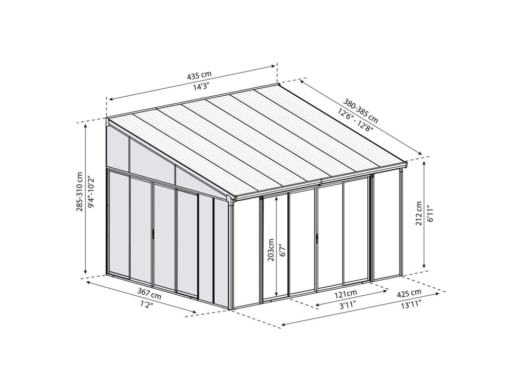 | Rozměry skleníku (D x Š x V): | 385 x 435 x 285-310 cm |