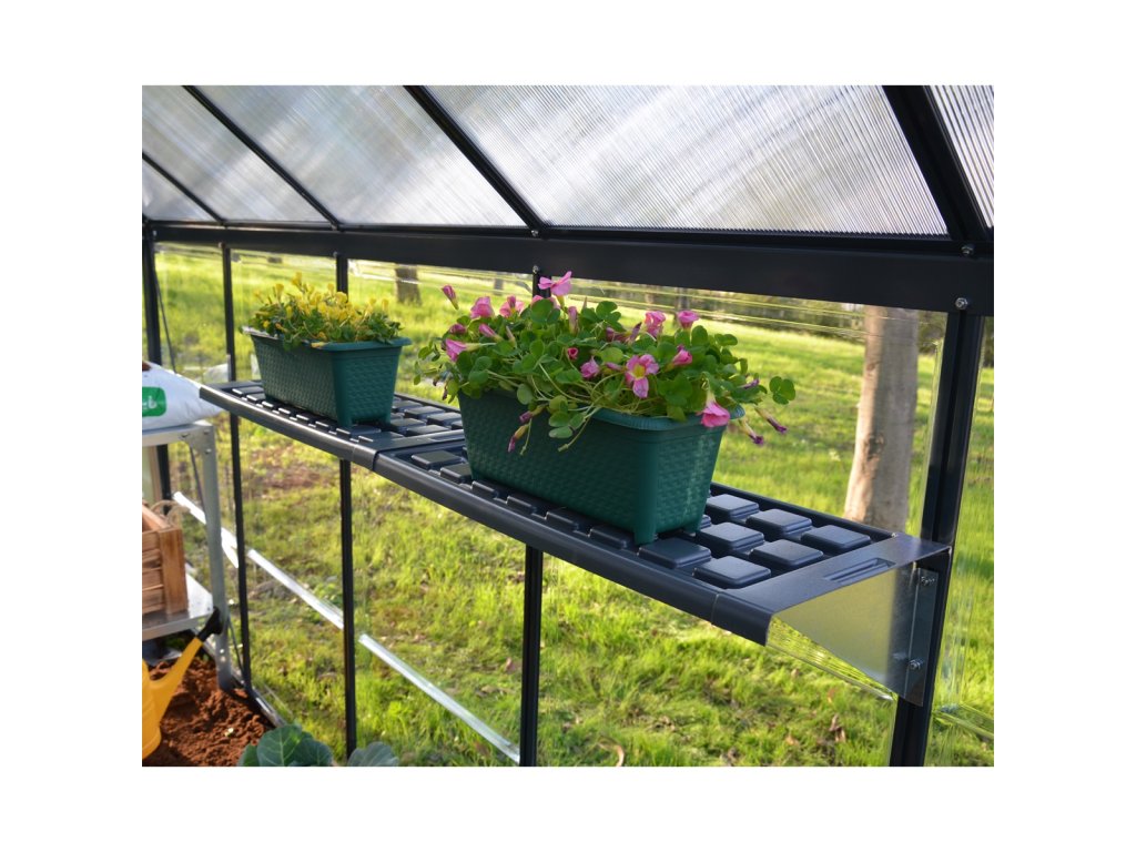 Univerzální police – set 2 ksSet polic se skládá ze 2 kusů. Každá má rozměr 62,5 x 26 cm a nosnost 20 kg. Police jsou ideální způsob, jak zlepšit organizaci ve svém skleníku, zvětšit užitný prostor a omezit námahu při pravidelné péči o rostliny v květináči. Systém uchycení poliček je velmi jednoduchý a využívá drážky, které jsou zevnitř na rámu skleníků Palram. Můžete si tedy vybrat, kam chcete poličky umístit a rovněž i to, zda vytvoříte jednu dlouhou nebo police umístíte každou zvlášť. Police mohou být v závislosti na vašich potřebách během sezóny kdykoliv jednoduše přemístěny na jiné místo skleníku. Balení obsahuje vše potřebné - 2 police, podpěry a spojovací materiál.