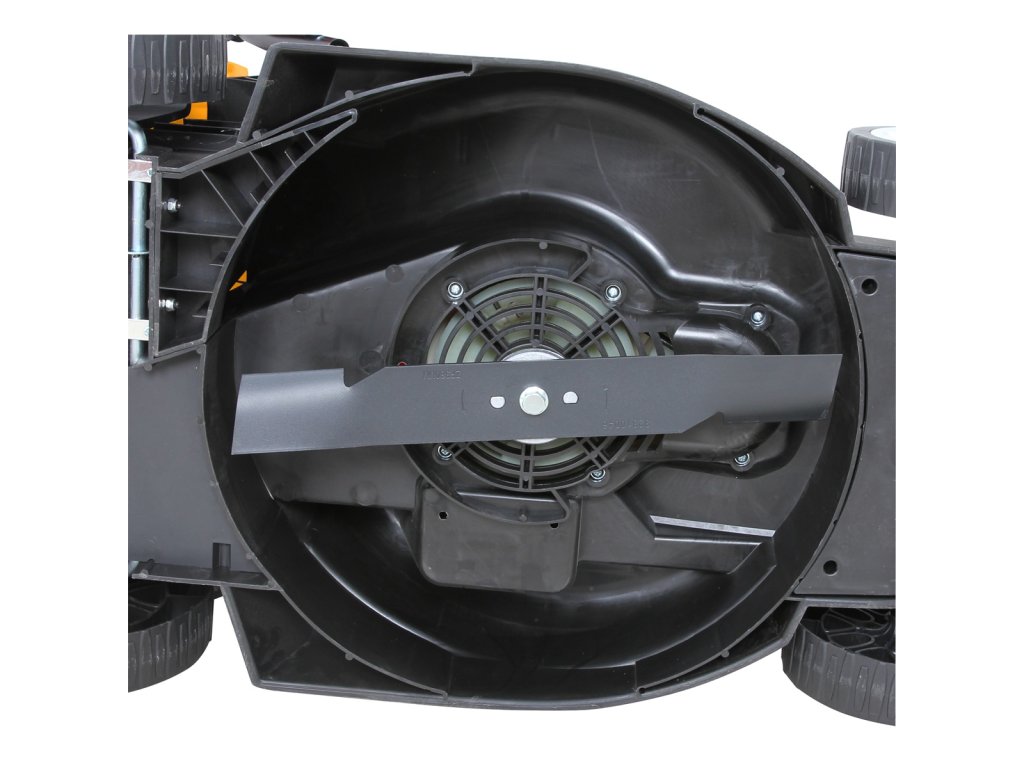 Šasi je vyrobeno z odolného polypropylenového plastu, což činí sekačku znatelně lehčí a hlavně podvozek nepodléhá korozi. Celá sekačka je pak posazena na poctivých pojezdových kolech o průměru 150 a 200 mm, která jsou upevněna kluzně na hřídeli. Nespornou výhodou celé konstrukce je také možnost centrálního nastavení výšky sečení od 25 do 75 mm (celkem 5 pozic) skrze dlouhou, snadno ovladatelnou páku.
