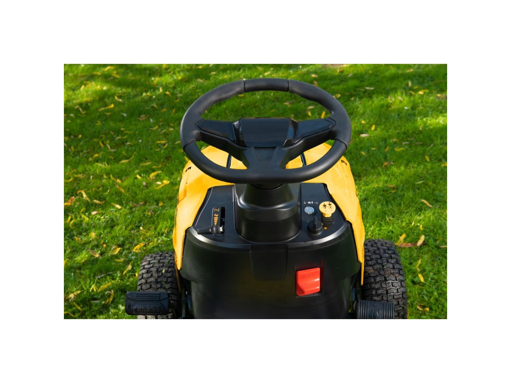 Traktor je vybaven moderními LED světlomety, širokým předním nárazníkem a integrovanou tryskou pro připojení hadice, která umožňuje snadné čištění žacího prostoru. Praktickým detailem je držák na nápoje a sada základního nářadí dodávaná spolu se strojem. Díky tažnému zařízení lze připojit širokou škálu příslušenství – od vozíků a rozmetadel až po válce, provzdušňovače nebo odmechovače. Veškeré příslušentství je k vidění v sekci "Příslušenství" nacházející se pod popisem.