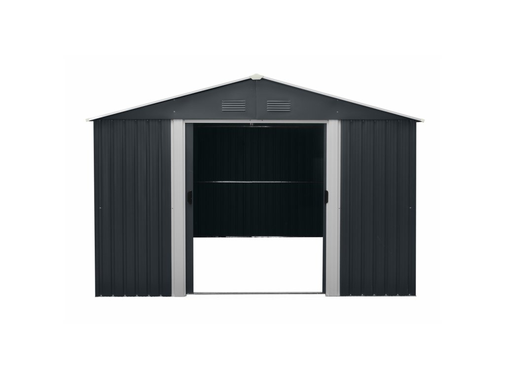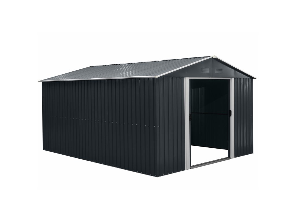 RMSA 12x10 Anthracite - zahradní domek kovový 3 x 3,7 m se sedlovou střechou antracitvelký zahradní domek ideální pro uskladnění zahradní techniky a nářadí, grilovacích potřeb, zahradního nábytku, sportovního náčiní, motorky, hraček atd.