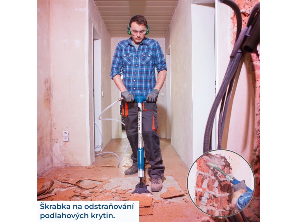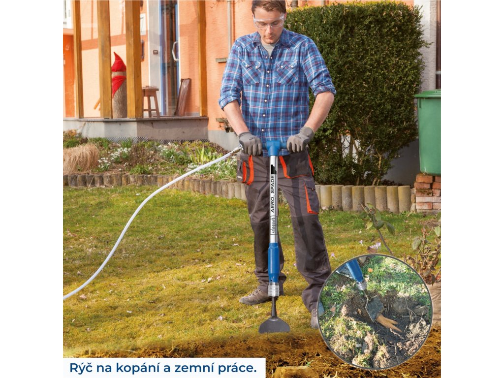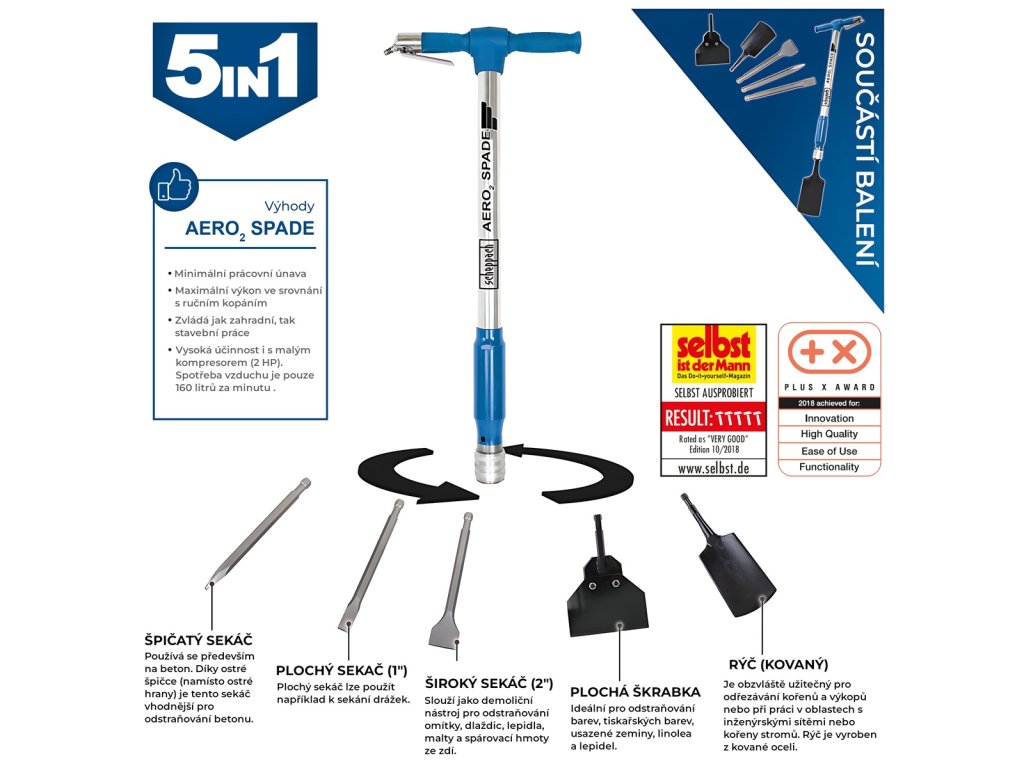 AERO2 SPADE - pneumatický multifunkční nástroj 5 v 1S multifunkčním pneumatickým nástrojem Aero2 Spade od Scheppachu se stane mnoho těžkých úkolů výrazně snazšími. Kopání a rytí ve ztvrdlé zemině, vykopávání starých stromků a keřů, odstraňování starých povrchů, odsekávání dlaždic, bourací práce apod. budou s tímto nástrojem daleko méně náročné. Aero 2 Spade je vhodný pro hobby i profesionální zahradníky, pro řemeslníky ze stavebních oborů a pro všechny, kdo např. rekonstruují rodinný domek. Kompaktní design je příjemný na ovládání a není s ním problém dosáhnout i do těžko přístupných míst. Rukojeti mají gumový povrch tlumící vibrace. Rychloupínací systém výměny nástrojů umožňuje jejich snadnou a rychlou výměnu. Rovněž připojení ke kompresoru rychlospojkou je dílem okamžiku. Pět standardně dodávaných nástrojů od sekáčů přes škrabku až po rýč je zárukou opravdu univerzálního využití.