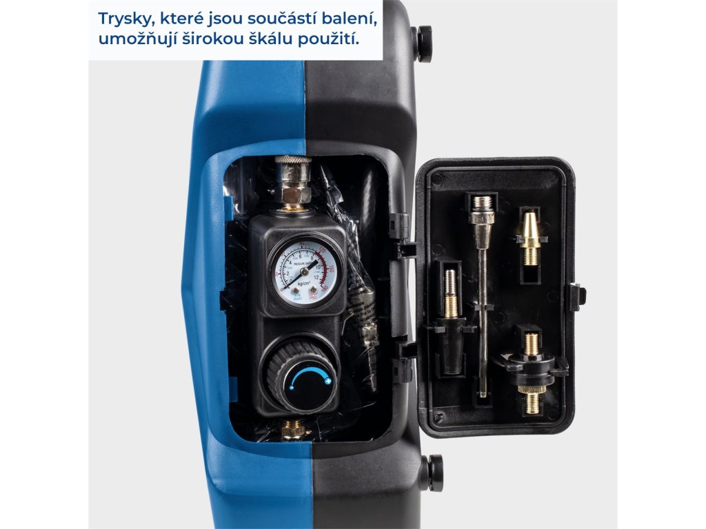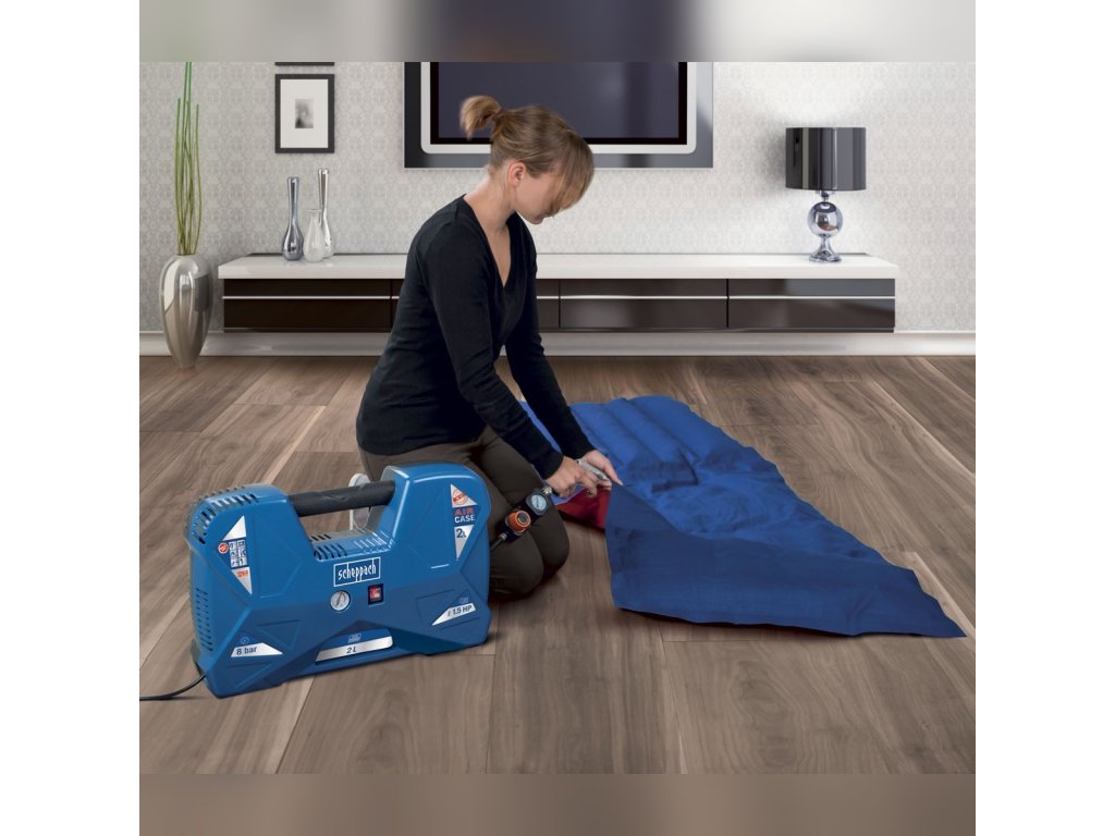 Aircase - bezolejový kompresorMalý, skladný, tichý, lehký, přesto ale výkonný a bohatě vybavený. Takový je tento skvělý kompresor Scheppach AIR CASE. Výborně se hodí do každé domácnosti, chaty, karavanu nebo malé dílny. Nadstandardní výbava zahrnuje vzdušník o objemu 2 l, díky kterému si dofouknete kolo ve sklepě i bez nutnosti přívodu elektřiny, 9 různých koncovek, díky kterým nafouknete vše od míče, přes pneumatiky a lehátka, až třeba po nafukovací bazén, 3 m hadici s integrovaným manometrem a ovladačem nastavení tlaku, praktickou ofukovací pistoli, integrované prostory pro uložení příslušenství i hadice, pohodlné madlo a manometr vzdušníku. Kompresor je vybavený nejmodernějším motorem s bezolejovou technologií, takže nikdy není potřeba kontrolovat hladinu oleje ani se starat o jeho stáří. Kompresor je tak vždy připravený odvést svoji práci. Jeho rozměry a nízká váha pouhých 8 kg ho rovněž předurčují k využití při stanování, kempování a jiných outdorových aktivitách.Podmínky prodloužené záruky naleznete zde.Případné bezpečnostní pokyny, výstrahy a upozornění jsou součástí návodu k obsluze, který je k dispozici v sekci KE STAŽENÍ.