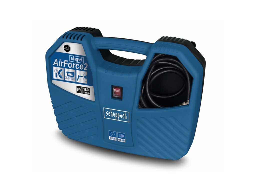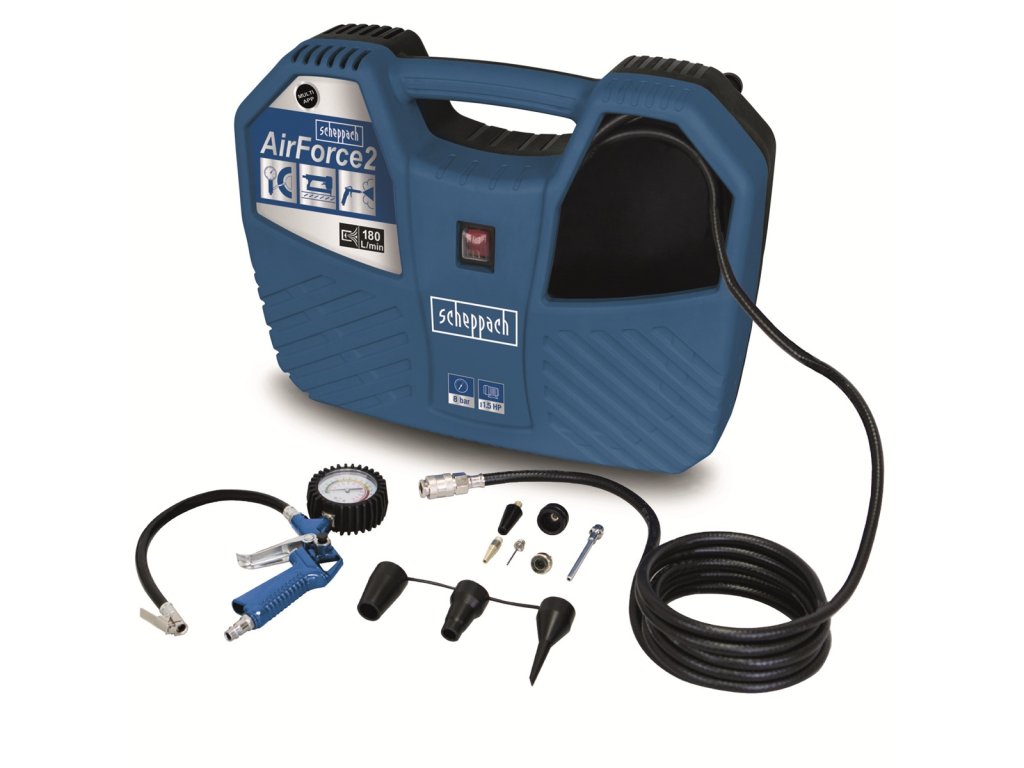 Air Force 2 - bezolejový kompresorKompresor Scheppach AIR FORCE 2 je praktický, skladný, lehký, výkonný a bohatě vybavený pomocník vhodný do každé domácnosti, chaty, karavanu nebo lodě. Díky velkému množství různých koncovek, silnému motoru a vysokému pracovnímu tlaku si hravě poradí s foukáním pneumatik motocyklů, kol, aut, terénních čtyřkolek, míčů, matrací, nafukovacích člunů, raftů apod. Veškeré příslušenství, včetně elektrického kabelu, 3 m tlakové hadice, pistole s manometrem a devíti různých koncovek je chytře ukryto uvnitř kompresoru, takže se Vám nic neztratí. Pohodlné madlo usnadní přenášení. Kompresor je vybavený nejmodernějším motorem s bezolejovou technologií. Kontrola oleje, jeho doplňování nebo výměna tak vůbec není potřeba a kompresor je vždy připravený odvést svoji práci. Jeho rozměry a váha pouhých 5,5 kg ho rovněž předurčují k využití při stanování, kempování a jiných outdoorových aktivitách.