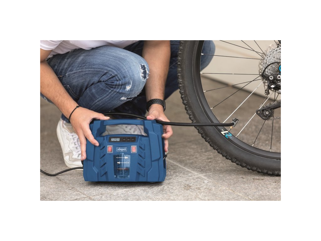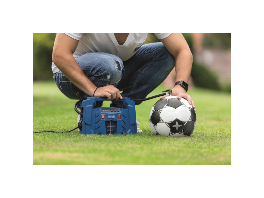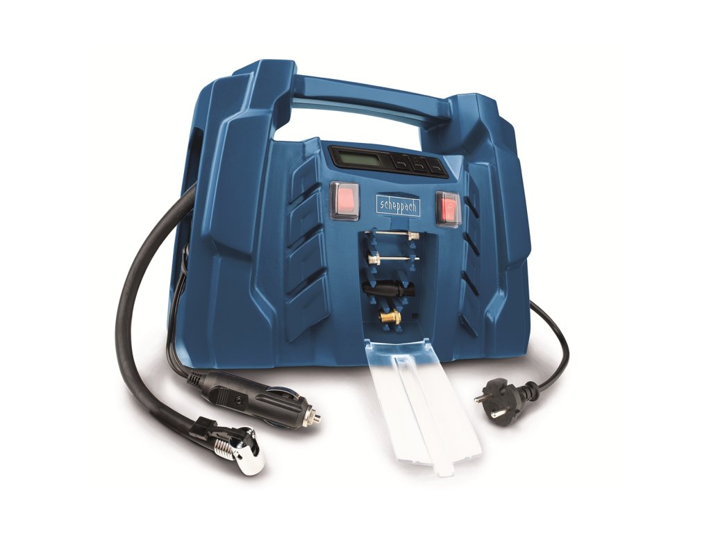 Air Force 5 - bezolejový mobilní kompresor 8 bar na 12 V/230 VKompresor Scheppach AIR FORCE 5 je malý, ale užitečný pomocník, kterého můžete napájet jak z běžné sítě na 230 V, tak i z běžné automobilové zásuvky na 12 V. Uplatní se tak nejenom jako praktický, skladný, a lehký kompresor ve vaší dílně nebo garáži, ale využijete ho i na cestách v autě nebo karavanu. Obsluha je velmi jednoduchá. Na digitálním displeji vidíte aktuální hodnotu tlaku. Ten si jde rovněž v rozmezí 0,1 až 8 bar předvolit a po dosažení nastaveného tlaku se kompresor automaticky vypne. Díky velkému množství různých koncovek a maximálnímu tlaku až 8 barů si hravě poradí s foukáním pneumatik motocyklů, kol, aut, terénních čtyřkolek, míčů, matrací, nafukovacích člunů, raftů apod. Veškeré příslušenství, včetně dvou elektrických kabelů, tlakové hadice 0,6 m a čtyř různých koncovek je chytře ukryto uvnitř kompresoru, takže se Vám nic neztratí. Pohodlné madlo usnadní přenášení. Kompresor je vybavený nejmodernějším motorem s bezolejovou technologií. Kontrola oleje, jeho doplňování nebo výměna tak vůbec není potřeba a kompresor je tak vždy připravený odvést svoji práci. Jeho rozměry a váha pouhých 1,9 kg ho rovněž předurčují k využití při stanování, kempování a jiných outdoorových aktivitách.