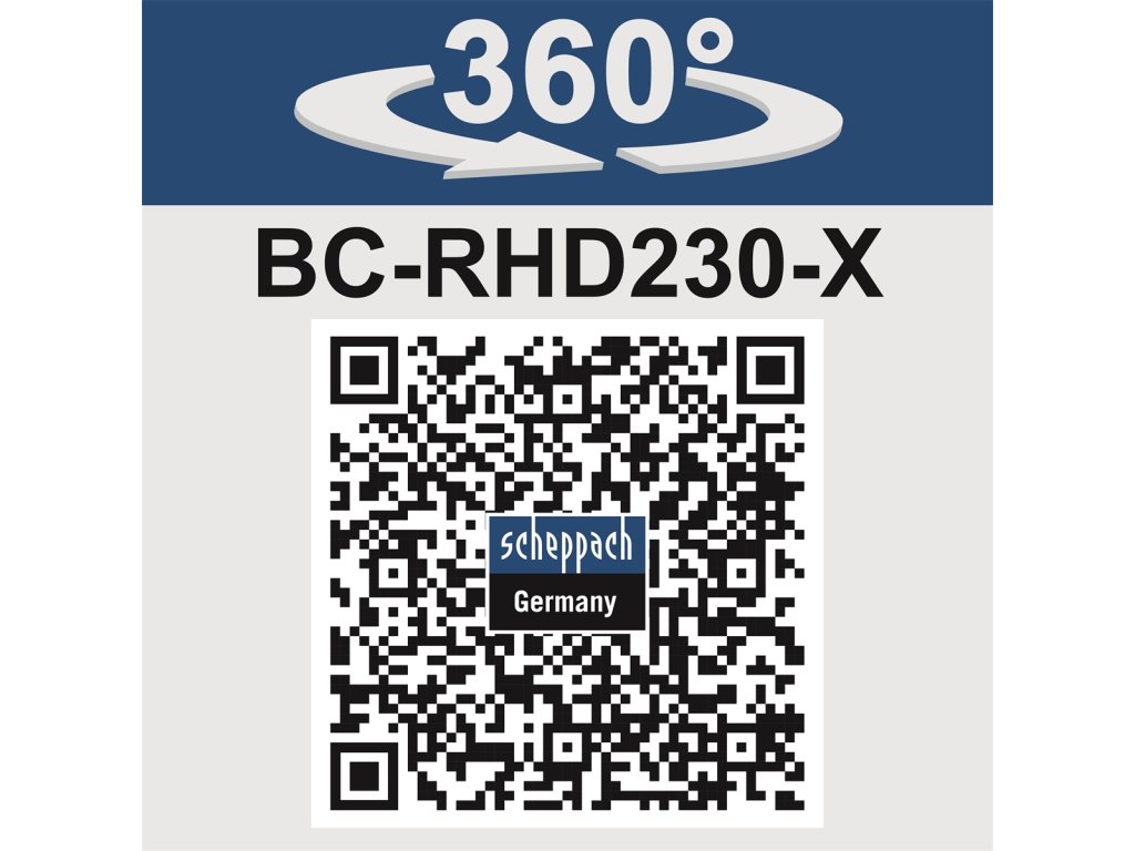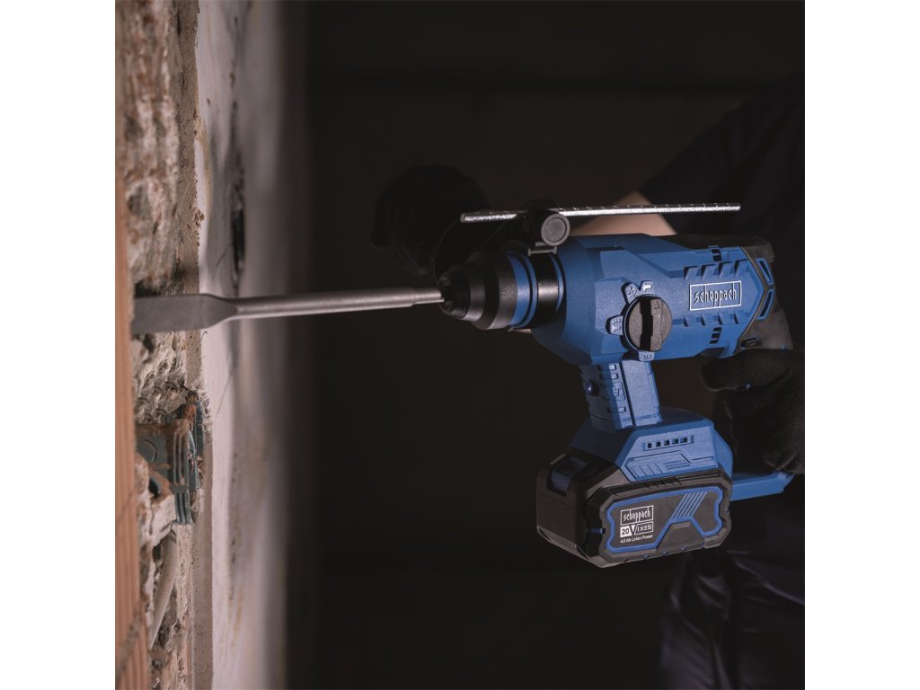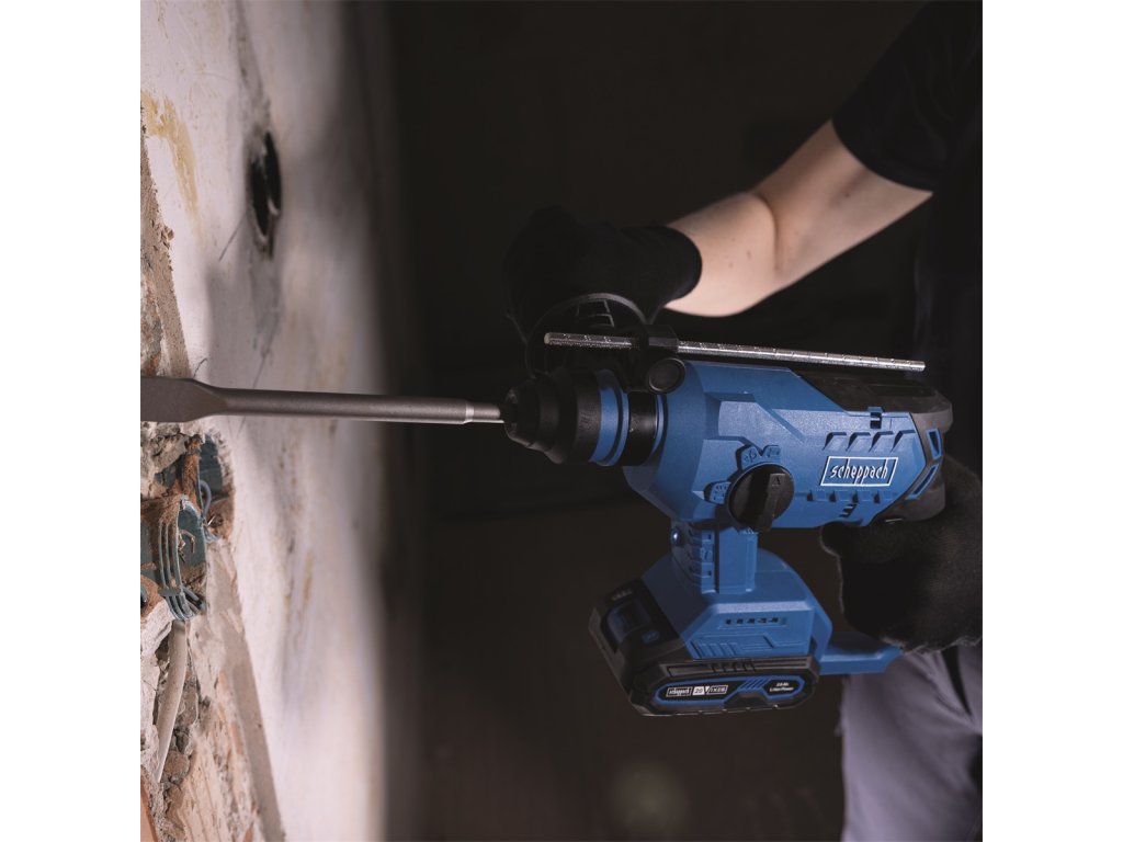 Scheppach BC-RHD230-X je skvěle vybavené, kompaktní, multifunkční akumulátorové kladivo, které se skvěle hodí na všechny běžné stavební práce, a to i tam, kde není přísun elektrické energie.Kladivo disponuje širokým rozsahem otáček s maximem 1400 ot/min. a silou úderu 2,2 J. Disponuje celkem čtyřmi funkcemi: vrtání (pro vrtání do dřeva, plastu nebo kovu), vrtání s příklepem (pro vrtání do betonu, cihel nebo zdiva), sekání (odstraňování dlaždic, čištění ploch od nálitků, sekání vedení pro kabely apod.) a sekání s uzamknutím sekáče v požadované poloze. Uchycení SDS Plus zajišťuje snadnou a rychlou výměnu nástroje bez použití nářadí. Další výbava zahrnuje například měkčené protiskluzové rukojeti nebo LED osvětlení s funkcí dosvitu 10 s po vypnutí. Stroj se dodává bez baterie a nabíječky.