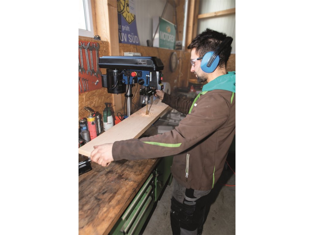 DP 16 SL - stojanová vrtačka s křížovým laserem• Stojanová vrtačka Scheppach DP 16 SL je výborně vybavený model vhodný hlavně pro náročné kutily, do dílen ap. Zásadní odlišností od ostatních modelů je křížový laser, který umožní velmi snadnou orientaci při vrtání a urychlí práci při vrtání větších sérií obrobků. Stroj má robustní konstrukci z odolné litiny, sklíčidlo 13 mm ve standardu, pět stupňů rychlosti pro práci s tvrdým a měkkým dřevem, kovy i plasty, svěrák pro přidržení obrobku na pracovním stole a silný motor 550 W, který si poradí s jakýmkoliv materiálem. Stroj samozřejmě splňuje poslední požadavky evropské unie na bezpečnost, jako je např. hlavní vypínač umístěný na čele stroje, průhledný kryt sklíčidla ap. Stroj je umístěn na stabilním podstavci s možností pevného uchycení šrouby k pracovní desce nebo podlaze.