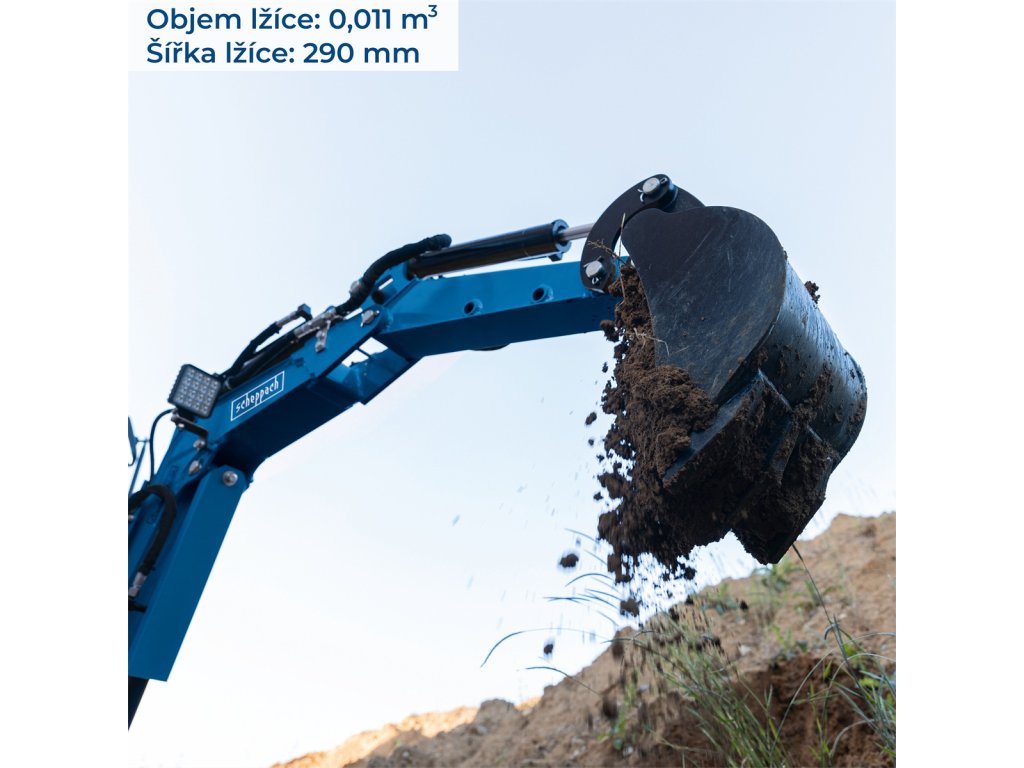 Tento kompaktní mini bagr s provozní hmotností 563,5 kg a schopností mimoosého kopání je ideálním pomocníkem pro širokou škálu výkopových prací, údržbě zahrad, vyrovnávání půdy, nakládání a vykládání materiálů na vozidlo apod. Díky své štíhlé konstrukci s rozchodem pásů pouhých 690 mm se snadno dostane i do úzkých průchodů a stísněných prostor.Pracovní parametry zahrnují maximální hloubku výkopu 1 200 mm, dosah 2 330 mm, výšku nakládání až 1 350 mm a výšku vysypání až 2 100 mm. Rameno lze natočit v úhlu +/- 70°, což umožňuje precizní práci i v úzkých prostorech. Standardně je vybaveno 290 mm širokou lžící s objemem 0,011 m3, která je vhodná pro menší zemní práce. Dále minibagr disponuje robustním gumovým pásovým pohonem s šířkou 150 mm, který lze ovládat nezávisle. Pojezd umožňuje maximální rychlost 1,7 km/h a stoupavost do 15°. Součástí je také velká nivelační radlice, kterou lze snížit pro stabilizaci ramene nebo k přesunu zeminy. O dobrou viditelnost ve zhoršených světelných podmínkách se stará výkonné LED osvětlení integrované do ramene stroje.