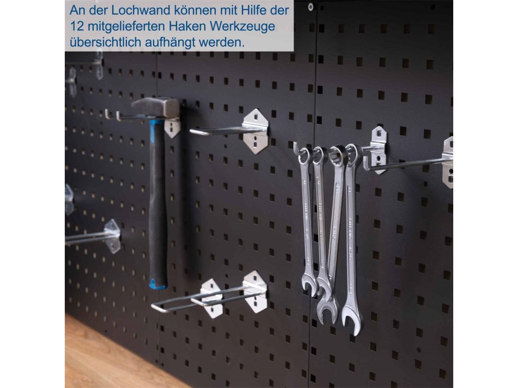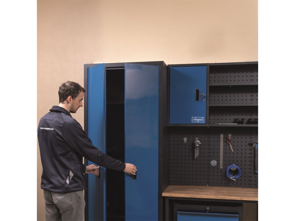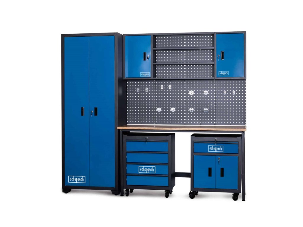 GWS 08 - dílenská sestava modulárníModulární dílenský systém Scheppach GWS 08 je ideálním řešením pro každou dílnu, a to i s omezeným prostorem. Obsahuje základní vybavení, které vám pomůže efektivně zorganizovat pracovní prostředí a mít vše potřebné po ruce. Sada zahrnuje jednu skříň, závěsnou skříň, pracovní stůl, dva pojízdné dílenské vozíky, perforovanou stěnu a dvanáct háků, díky kterým bude vaše dílna perfektně uspořádaná. Všechny prvky jsou vyrobeny z robustního, práškově lakovaného ocelového plechu, takže jsou odolné a mají dlouhou životnost. Skříně jsou uzamykatelné, což umožňuje bezpečné uložení pracovního vybavení a nástrojů. Samostatná skříň je vybavena křídlovými dveřmi, nastavitelnými policemi s nosností 30 kg na polici a výškově stavitelnými nožičkami pro lepší stabilitu i na nerovných podlahách. Závěsná skříň má uzamykatelné dveře na obou stranách a otevřenou střední část se třemi policemi, které unesou celkem 50 kg. V zadní části má perforovanou stěnu s normovaným otvorem 10 x 10 mm a roztečí 38 mm, což umožňuje snadné připevnění háků a dalších doplňků. Součástí balení je také dvanáct háků pro různé nástroje – šest jednoduchých háků, tři dvojité a tři uzavřené dvojité háky. Dva dílenské vozíky se postarají o mobilitu a flexibilitu v organizaci nářadí. Jeden vozík nabízí čtyři uzamykatelné zásuvky, zatímco druhý je vybaven jednou zásuvkou a dvěma uzamykatelnými skříňkami. Oba vozíky jsou na čtyřech kolečkách, z nichž dvě lze zabrzdit. Nosnost každé zásuvky činí 10 kg. Pracovní stůl s pevnou pracovní deskou o rozměrech 1600 x 500 mm poskytuje velkorysou pracovní plochu. Výškově nastavitelné nohy zajišťují stabilitu na jakémkoliv povrchu. Systém doplňuje perforovaná stěna s normovanými otvory 10 x 10 mm a roztečí 38 mm, což umožňuje variabilní uspořádání nářadí a pomůcek. Tento dílenský modulový systém kombinuje funkčnost, kvalitu a flexibilitu, a je proto ideálním řešením pro každého, kdo chce mít v dílně pořádek a pracovat efektivně.