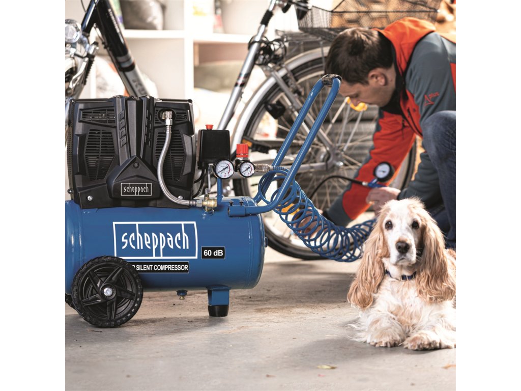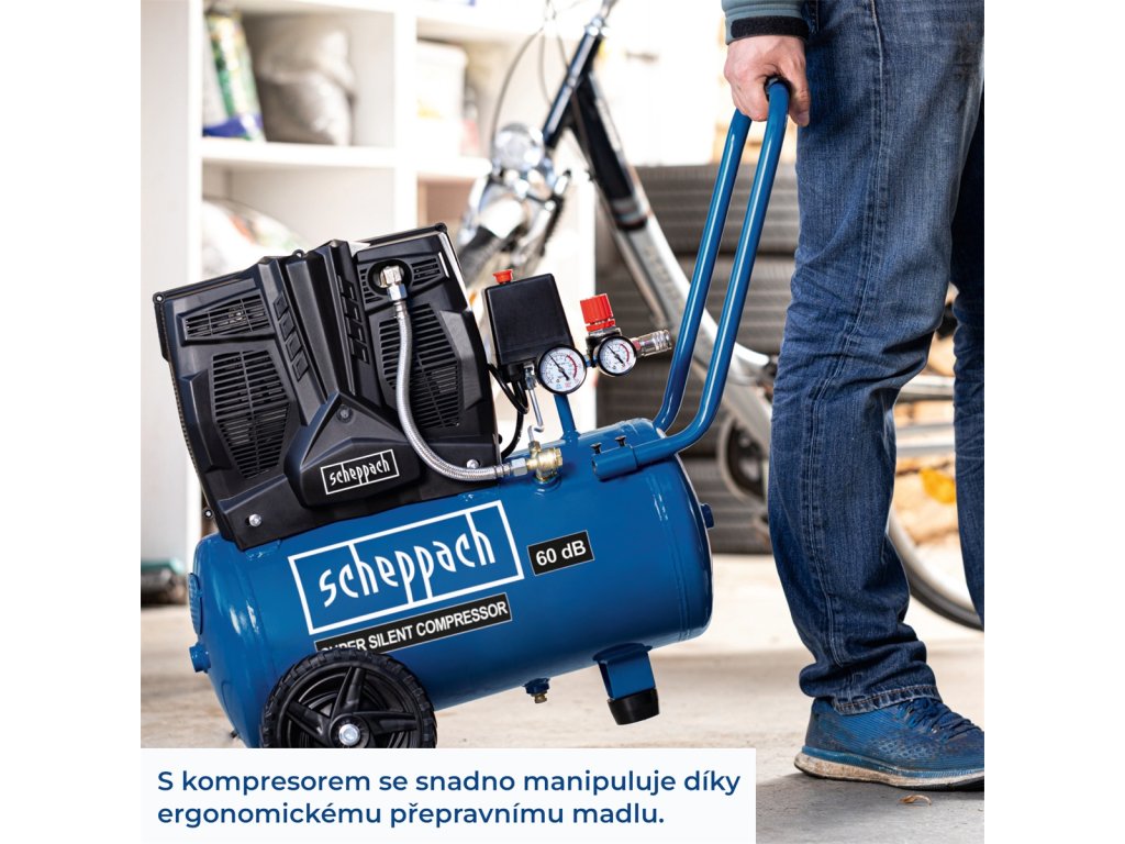 HC 25 Si - tichý bezolejový dvouválcový kompresor 24 lKompresor Scheppach HC 25 Si je tichý bezolejový dvouválcový kompresor, který je vhodný i do míst a provozů s vysokými požadavky na nízkou míru hluku. Hlučnost 60 dB (A) znamená hladinu hluku zhruba na úrovni bublání varné konvice, takže v praxi budete vnímat hluk tohoto kompresoru pouze minimálně. Další výhodou je bezolejová technologie, která znamená, že do vzdušníku ani dále do spotřebiče vzduchu, neunikají žádné olejové páry. To se hodí v potravinářství, u speciálních lakýrnických prací nebo třeba při tlakování výčepních zařízení. Bezolejová technologie znamená rovněž mnohem nižší nároky na údržbu celého stroje. Scheppach rovněž odstranil běžnou nevýhodu tichých kompresorů, a to poměrně nízký sací výkon. Díky nové technologii je sací výkon 230 l/min téměř dvakrát vyšší, než je běžné a je plně srovnatelný s klasickými kompresory. Vzdušník o objemu 24 l slouží jako zásobárna stlačeného vzduchu a motor se tak automaticky zapíná jen v případě, že tlak vzduchu klesne pod požadovanou úroveň. Vzdušník rovněž výrazně rozšiřuje možnosti kompresoru a stroj se tak stává opravdu multifunkčním pomocníkem. Díky němu můžete s kompresorem, mimo běžného huštění a ofukování, provádět i náročnější operace s použitím různých druhů pneumatického nářadí. Kompresor je vybaven manometrem vzdušníku i manometrem pro kontrolu pracovního tlaku. Přídavné madlo a kolečka umožní snadnou manipulaci se strojem, antivibrační podstavec zase zajistí klidný chod stroje.Případné bezpečnostní pokyny, výstrahy a upozornění jsou součástí návodu k obsluze, který je k dispozici v sekci KE STAŽENÍ.
