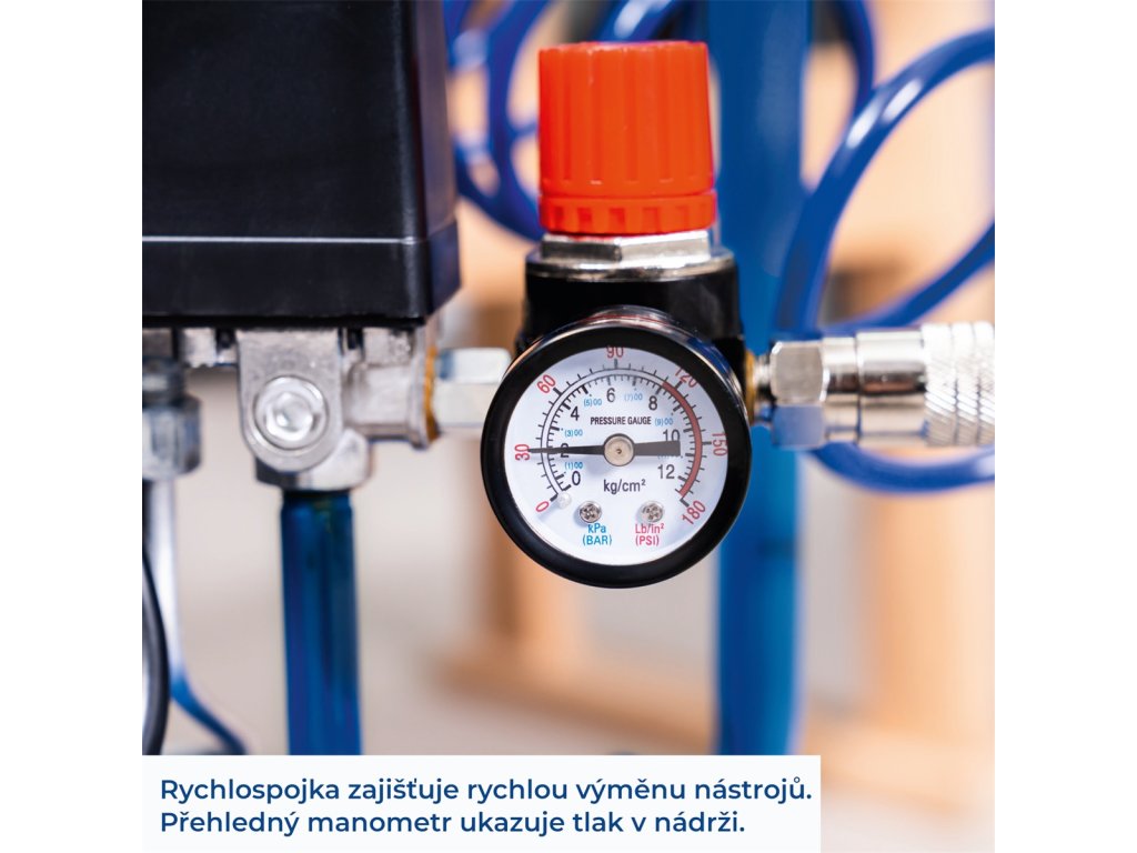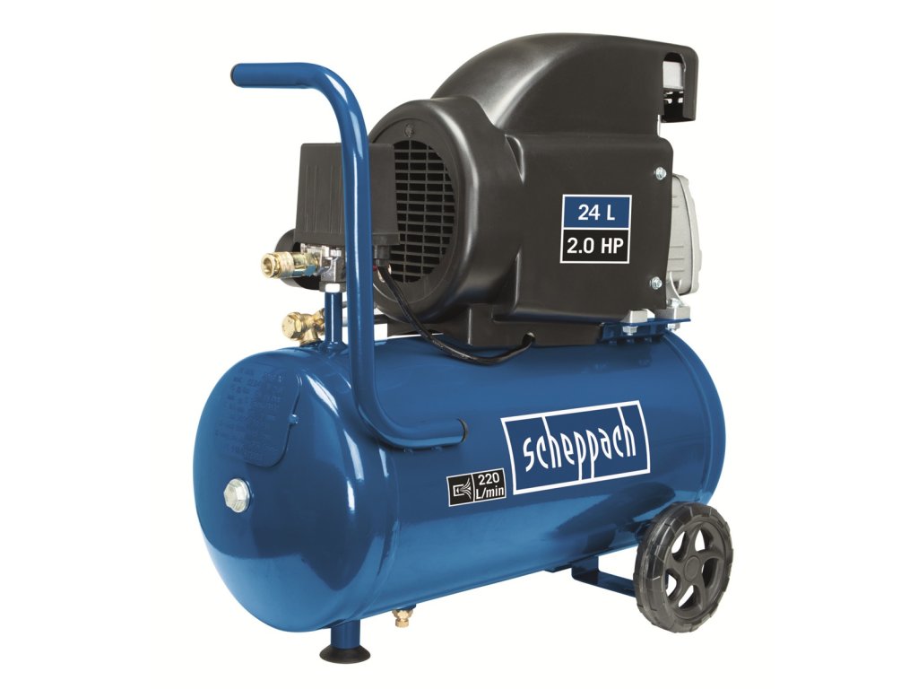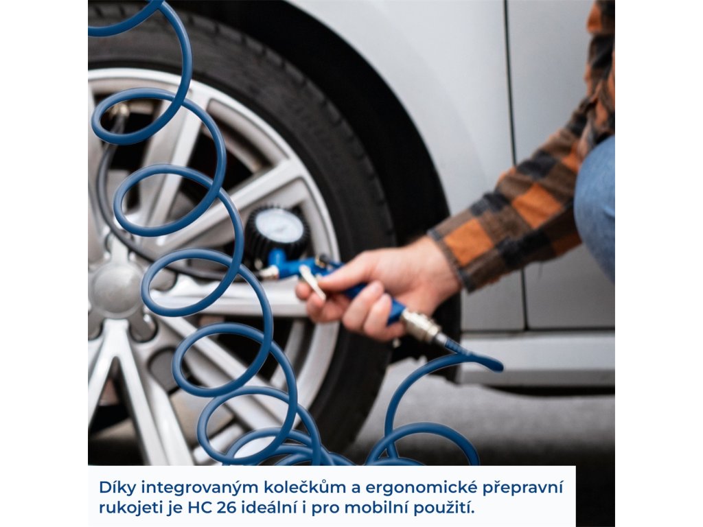HC 26 - olejový kompresor 24 lKompresor Scheppach HC 26 je spolehlivý stroj, který se hodí na všechny běžné práce spojené s huštěním, ofukováním nebo na použití s běžnými pneumatickými nástroji. Kompresor pohání silný motor o výkonu 1500 W, který zajistí rychlé natlakování vzdušníku o objemu 24 l. Vzdušník slouží jako zásobárna stlačeného vzduchu a motor se tak automaticky zapíná jen v případě, že tlak vzduchu klesne pod požadovanou úroveň. Pumpa stroje je mazána olejem, což zajišťuje dlouhou životnost celého kompresoru i při častějším používání. Kontrola stavu oleje je velmi jednoduchá a provádí se zběžným pohledem pomocí optického ukazatele umístěném na stroji. 230 ml kompresorového oleje DAB46 je součástí balení. Kompresor je vybaven manometrem vzdušníku, tlakovým spínačem a odkalovacím ventilem. Výstup na vzduch je opatřen rychlospojkou. Přídavné madlo a kolečka umožní snadnou manipulaci se strojem, antivibrační podstavec zase zajistí klidný chod stroje.