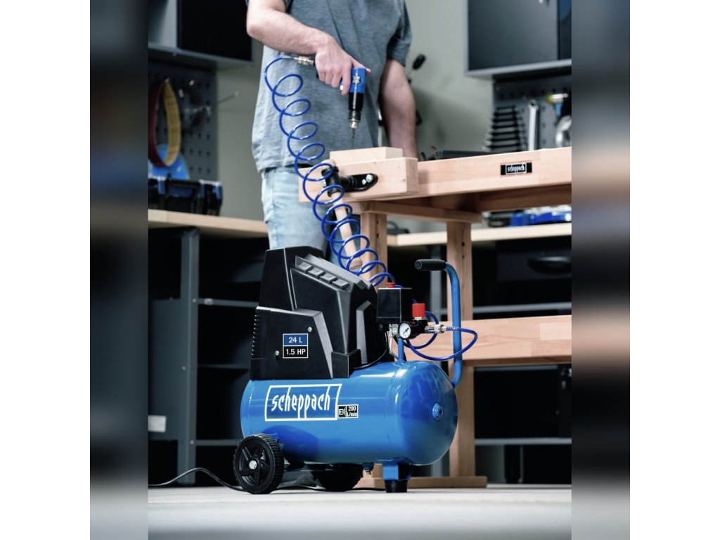 HC 30 OX - bezolejový kompresor 24 lKompresor Scheppach HC 30 OX je ideálním pomocníkem do každé domácnosti. Je neuvěřitelně snadný na údržbu. Jednak má moderní pumpu s bezolejovou technologií, takže se nikdy nemusíte starat o správnou hladinu oleje a jednak má nejmodernější technologii indukčního (bezuhlíkového) motoru. Takový motor je rovněž v podstatě bezúdržbový a díky menšímu počtu pohyblivých částí a mnohem menšímu počtu třecích ploch je jeho životnost několikanásobně delší než u klasického komutátorového motoru. Navíc je i výrazně tišší. Vzdušník slouží jako zásobárna stlačeného vzduchu a motor se tak zapíná jen v případě, že tlak vzduchu klesne pod požadovanou úroveň. Díky vzdušníku můžete s kompresorem provádět i náročnější operace, než je běžné huštění či ofukování. Můžete k němu připojit sponkovačku, mycí pistoli nebo zvládne i méně náročné stříkací práce s barvou či dalšími pneumatickými nástroji. Při dofukování pneumatik zase oceníte jednoduché nastavení výše tlaku, který můžete snadno kontrolovat pomocí vestavěného manometru. Díky bezolejové technologii se výborně hodí i k udržování tlaku v pivních sudech. Přídavná rukojeť a kolečka umožní snadnou manipulaci se strojem.