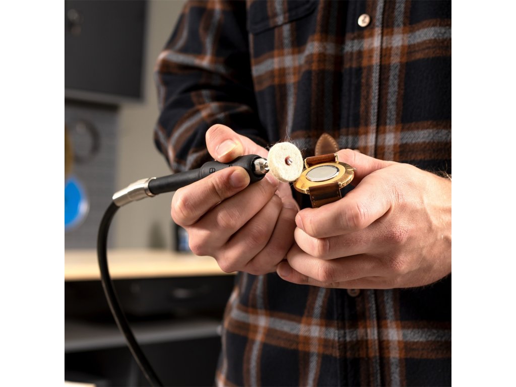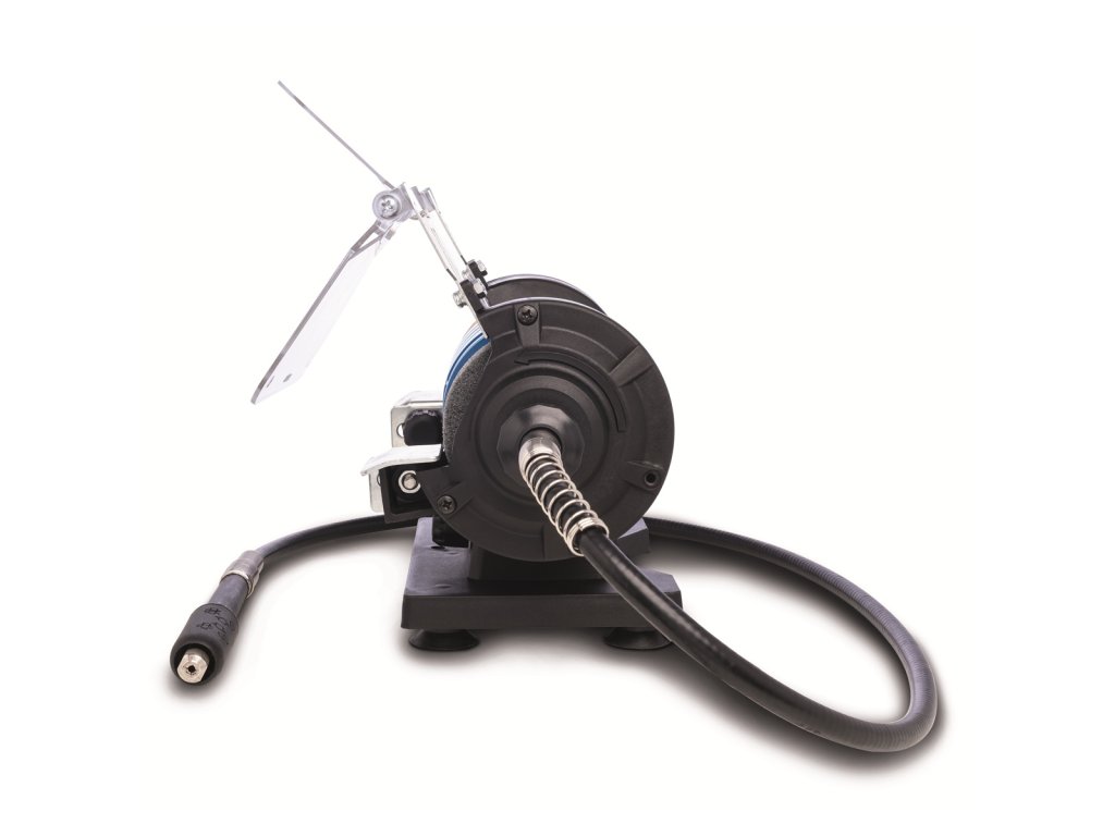 Další možnosti využití přináší flexibilní hřídel o délce 1 m. Díky standardně dodávanému 103 dílnému příslušenství v praktickém dřevěném boxu s ní můžete řezat, brousit nebo leštit mimo brusku samotnou. Stroj můžete přidělat k pracovní desce napevno nebo využít neklouzavé přísavné gumové nožičky.