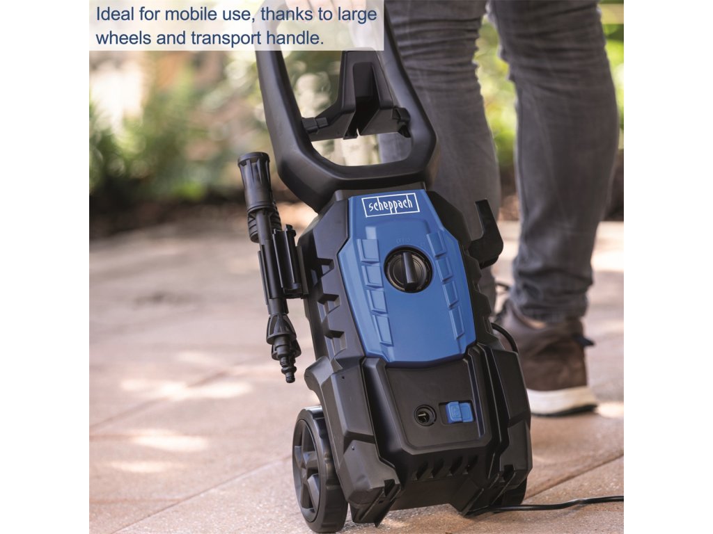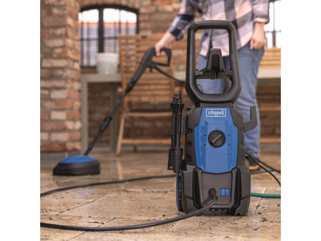 HPC 1600 KIT - elektrická tlaková myčka 135 bar s příslušenstvímTlaková myčka Scheppach HPC 1600 KIT je lehká a kompaktní myčka s bohatým příslušenstvím, se kterou lehce zvládnete všechny běžné úklidové práce kolem domu nebo dílny. Umytí auta, kola, zahradního nábytku, květináčů nebo zahradního náčiní a techniky se stane hračkou. Se standardně dodávaným čističem ploch není problém umýt dlažbu na verandě nebo podlahu v garáži. S váhou pouhých 7,2 kg, hadicí dlouhou 5 m, vysokým madlem a pojezdovými kolečky se s myčkou snadno manipuluje, přičemž silný motor o výkonu 1600 W a kvalitní kovové čerpadlo vyvinou maximální tlak až 135 barů. Pro snadnou obsluhu jsou připojovací prvky a hadice vybaveny rychlospojkami. Základní příslušenství, jako tlaková pistole a hadice se dají při skladování pohodlně umístit přímo v držácích na myčce. Myčka je vybavena čerpadlem se samonasávací funkcí. Myčku tak lze připojit nejenom ke kohoutku s tlakovou vodou, ale myčka si může sama nasávat vodu z kbelíku, sudu nebo z jiné nádrže. Nejste tak při mytí omezeni dostupností vody z běžného vodovodního řádu. Stroj je rovněž vybaven systémem Auto stop, kdy se při uvolnění spínače na tlakové pistoli rovněž vypíná motor.