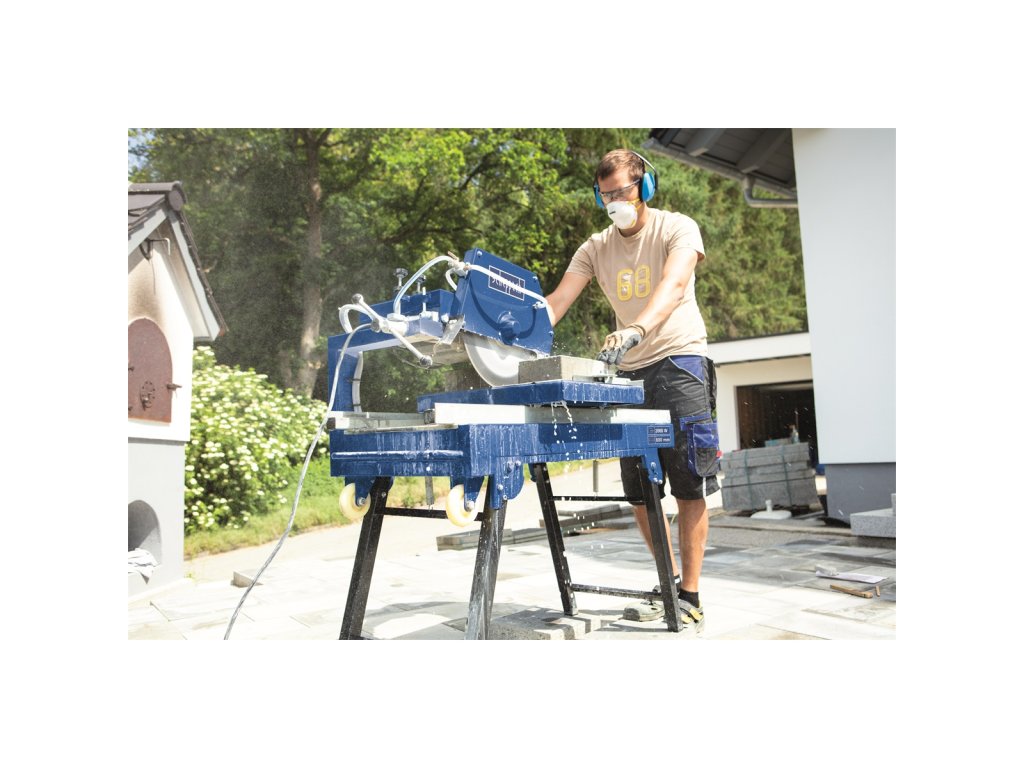 HSM 3500 - řezačka na dlažbu a kámenŘezačka Scheppach HSM 3500 je výborným pomocníkem všech profesionálních řemeslníků nebo náročných kutilů pracujících často s kamenem či dlažbou velkého formátu. Silný motor 2200 W s tepelnou ochranou si hravě poradí s řezáním keramické dlažby, žuly, mramoru, cihel apod. Zásadní výhodou je velká délka řezu 700 mm podél hrany (nebo 535 mm diagonálně), což této řezačce umožňuje pracovat i s velmi oblíbenými velkoformátovými dlaždicemi. Řezačka je osazena kvalitním diamantovým kotoučem o průměru 360 mm určeným pro mokré řezy. Řezná hlava se dá plynule nastavit v úhlu od 0° do 45°. Pracovní stůl je vybaven pojezdovými kolečky s ložisky, dovolující velmi hladký pohyb. Stůl je vybaven neklouzavou pogumovanou vrstvou a přesným úhlovým a podélným dorazem se stupnicí. Chlazení řezného kotouče vodou a bezprašnou práci zajišťuje integrované čerpadlo. Výhodou je i velká jímka na vodu. Stroj je vybaven nejmodernější bezpečnostní ochranou proti úrazu elektrickým proudem a rovněž zásuvka je vybavena proudovým chráničem. Pro snadný transport je stroj vybaven kolečky a skládacím podstavcem.Případné bezpečnostní pokyny, výstrahy a upozornění jsou součástí návodu k obsluze, který je k dispozici v sekci KE STAŽENÍ.