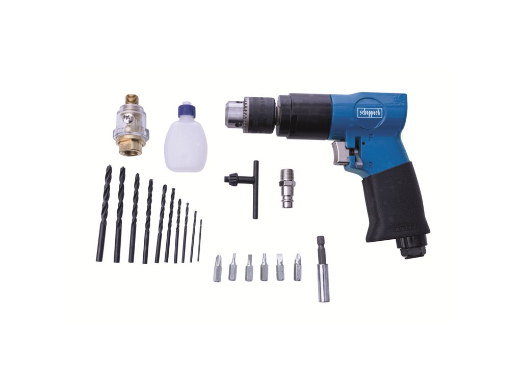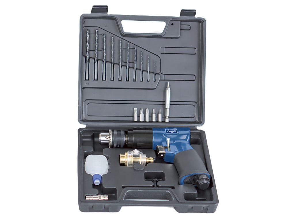 příslušenství: 10 x HSS vrták, 6 x CrV bit, 1 x držák bitů, maznička, olej, sklíčidlo, konektor pro rychlospojku, olejový přimazávač vzduchu