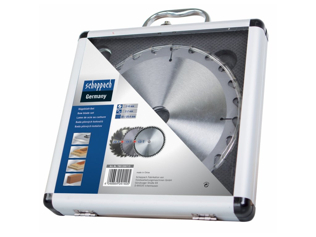 Sada 3 pilových kotoučů o průměru 210 mm, speciálně určených pro ponornou pilu Scheppach HM 210 L a stolové pily Scheppach HS 81 S a HS 80.Obsah kufříku: