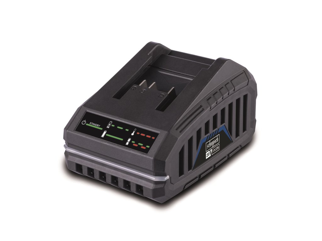 Scheppach SBC2.4A je kompaktní rychlá nabíječka, kterou lze nabíjet všechny 20 V lithium-iontové akumulátory Scheppach řady IXES. Jedná se o moderní inteligentní nabíječku, která sleduje stav jednotlivých článků, jejich teplotu a napětí a podle toho řídí jejich dobíjení. Ve výsledku se tak výrazně zvyšuje životnost baterie a maximalizuje počet nabíjecích cyklů akumulátoru. Nabíječka je vybavená indikací stavu nabíjení i možných chybových hlášení pomocí LED diod.2,0 Ah akumulátor nabijete přibližně za 60 minut, zatímco 4,0 Ah za 120 minut. Nabíječku můžete postavit na pracovní stůl nebo pomocí integrovaného držáku zavěsit na zeď.
