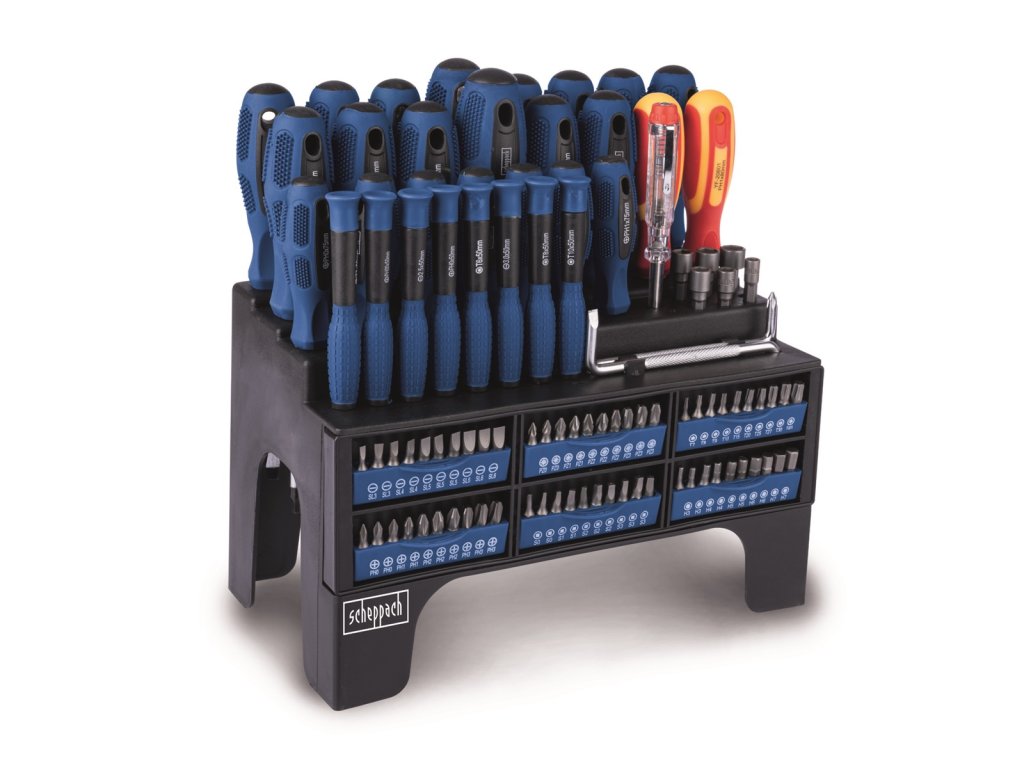 SDB 100-2 - sada 100 ks šroubováků a bitůScheppach SDB 100-2 je velmi bohatá sada kvalitních šroubováků, bitů a nástavců ukrytá v praktickém stabilním stojanu. Každý kus nářadí má přesně stanovené místo a bude tak vždy a rychle po ruce. Sada obsahuje i izolované šroubováky a zkoušečku napětí pro elektrikářské práce. Díky svým rozměrům stojan nezabere moc místa. Kvalitní slitina Cr-V (chrom-vanadium), magnetické hroty, jakostní plast na rukojetích i pogumované protiskluzové zóny zaručí, že Vám bude nářadí sloužit po mnoho let. Stojan se dá v případě potřeby rovněž připevnit na zeď.
