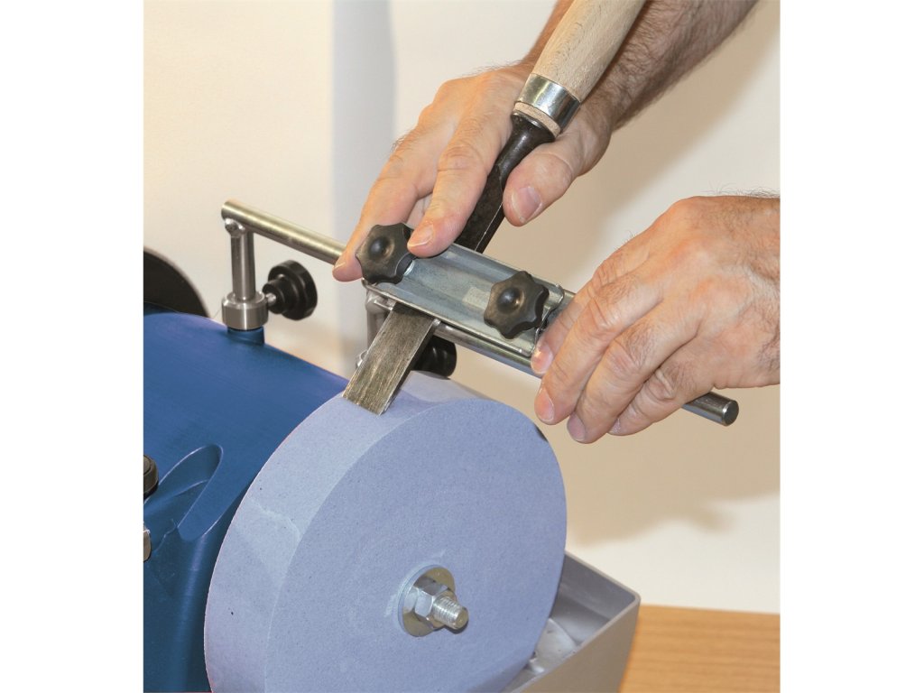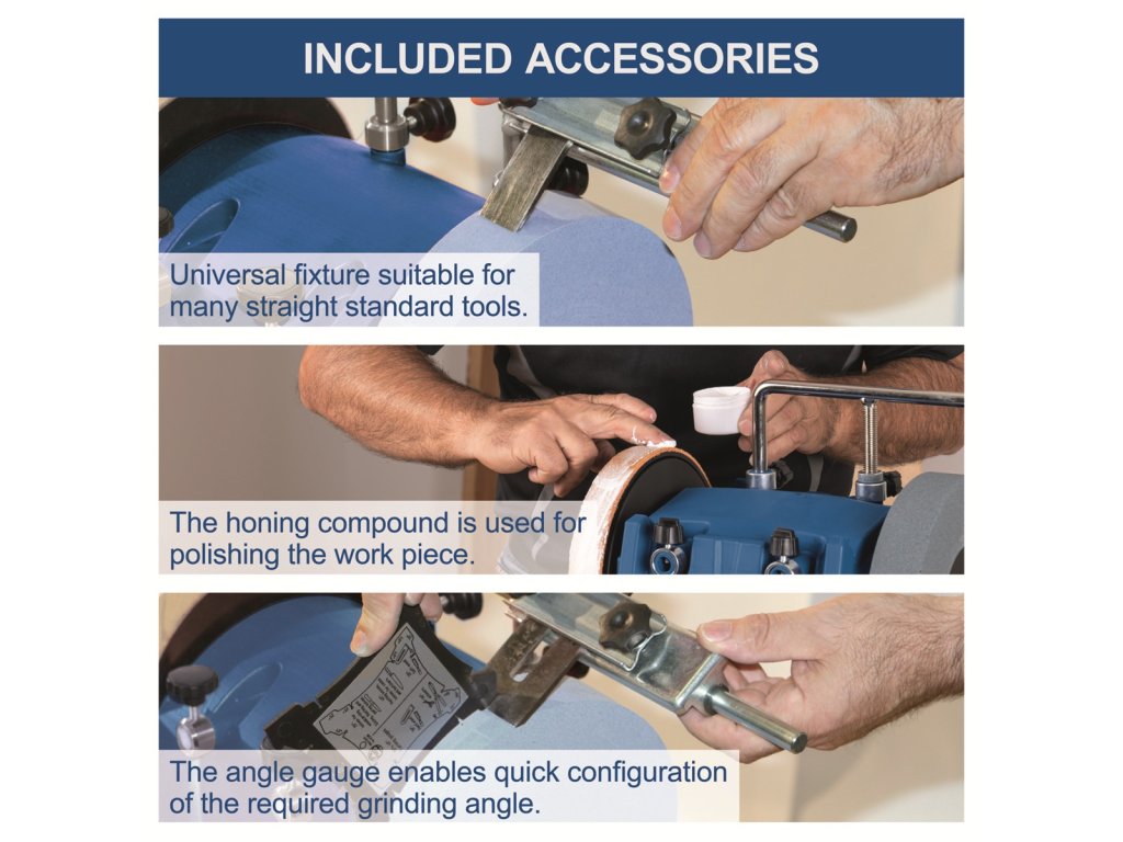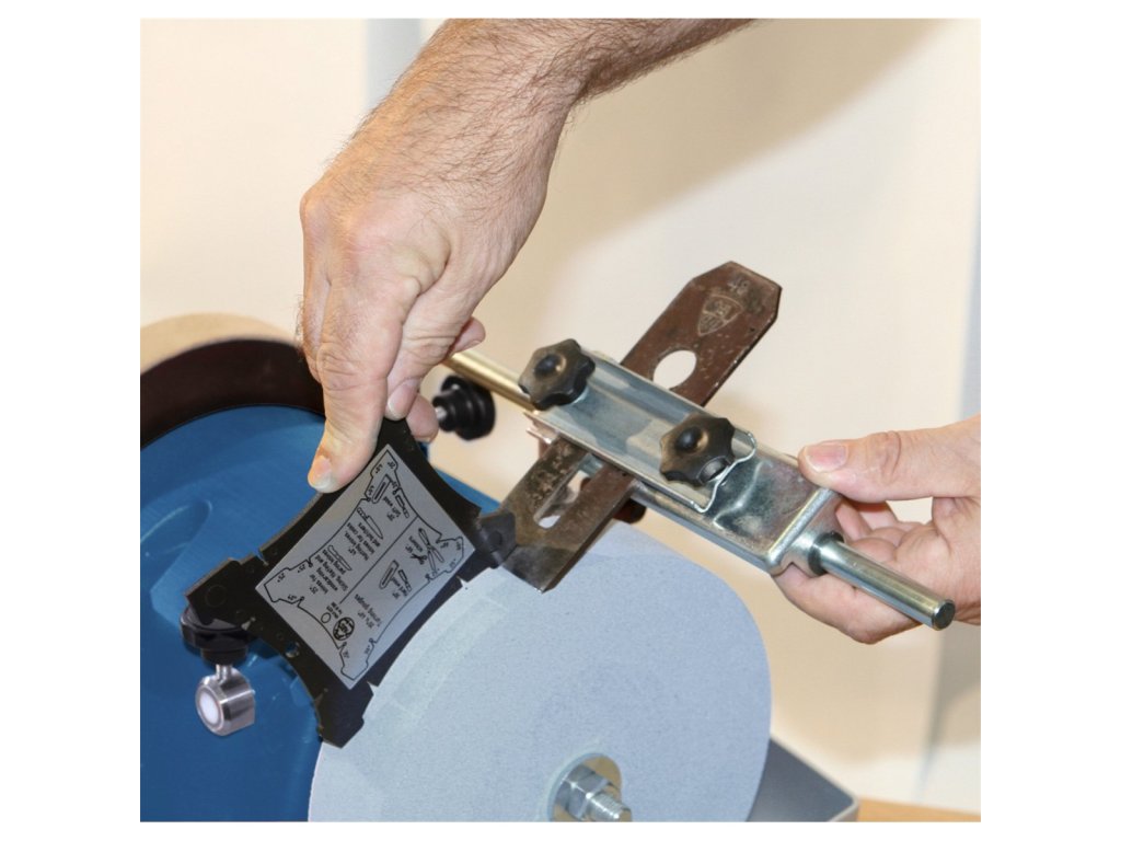Speciální brusný kámen s částečkami oxidu hlinitého se postará o perfektní ostří i u tvrdokovových nástrojů. Pro finální úpravu slouží kožený honovací kotouč, který dokonale zahladí mikrootřepy. Součástí je i nárazuvzdorná vanička na vodu.