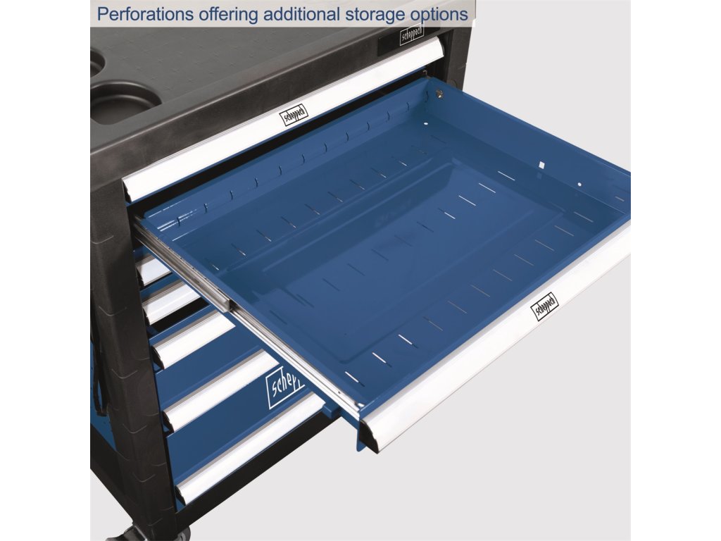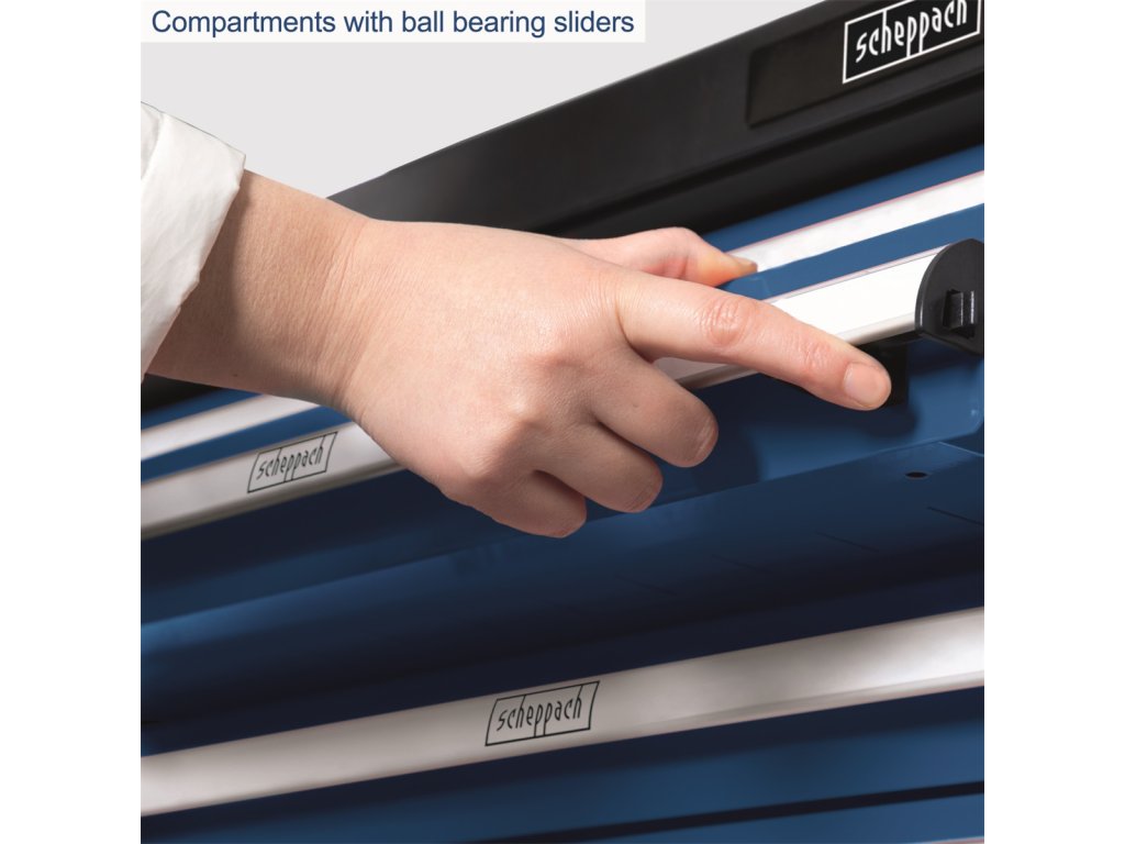TW 1000 - dílenský vozík s nářadím, 7 zásuvek, 263 dílůScheppach TW 1000 je profesionální celokovový dílenský vozík vhodný do domácích i řemeslných dílen, garáží, servisů apod. Vyznačuje se velmi tuhou konstrukcí, opláštěním hran vozíku tvrzeným plastem, pracovní deskou z odolného plastu s prolisy pro uložení drobného materiálu a s nízkým ochranným lemem, který udrží vaše nářadí vždy na místě. Pro snadnou manipulaci s vozíkem slouží dvě transportní měkčená madla a čtyři velká kola. Ty jsou pogumovaná a jedno z nich je plně otočné s integrovanou brzdou. Špičkovou kvalitu poznáte i podle snadné manipulace se zásuvkami. Ty jsou vybaveny velmi robustními a kvalitními pojezdy, takže se s nimi snadno manipuluje i při plném zatížení. Samozřejmostí je mechanismus bránící jejich samovolnému otevření a rovněž zámek, který chrání obsah před přístupem nepovolaných osob. Boční stěny vozíku jsou vybaveny děrovanou deskou, na kterou lze navěsit další nářadí nebo vhodné držáky či poličky. Čtyři zásuvky jsou vybaveny kvalitním běžně používaným nářadím (gola sady, kleště, různé druhy šroubováků, kladiva, klíče, elektrikářské díly apod.), zbylé tři zásuvky si můžete dovybavit nářadím dle svých požadavků. Každý kus nářadí má přesně stanovené místo a bude tak vždy a rychle po ruce.