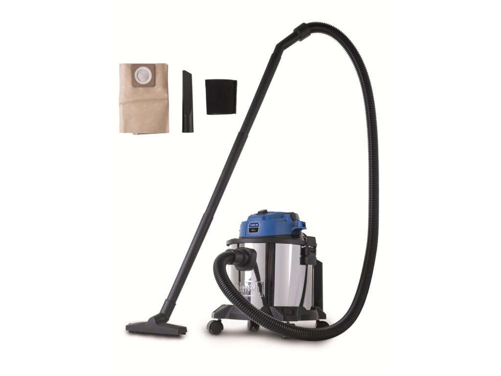 Srdcem přístroje je silný 1200 W elektromotor, jenž zajišťuje dlouhou životnost a spolehlivý chod. Velkorysý pracovní dosah zajišťuje 3 m přívodní kabel, 1,8 m dlouhá hadice a trojice prodlužovacích plastových trubic. Odolná nádoba z nerezové oceli s objemem 16 litrů je vybavena rychloupínacím uzávěrem, který umožňuje snadnou výměnu sáčku. Díky praktickým držákům je možné příslušenství uložit přímo na vysavač, takže máte vše vždy po ruce. Pro pohodlnou manipulaci je přístroj vybaven ergonomickým madlem a čtyřmi otočnými kolečky, která umožňují hladký pohyb do všech směrů.