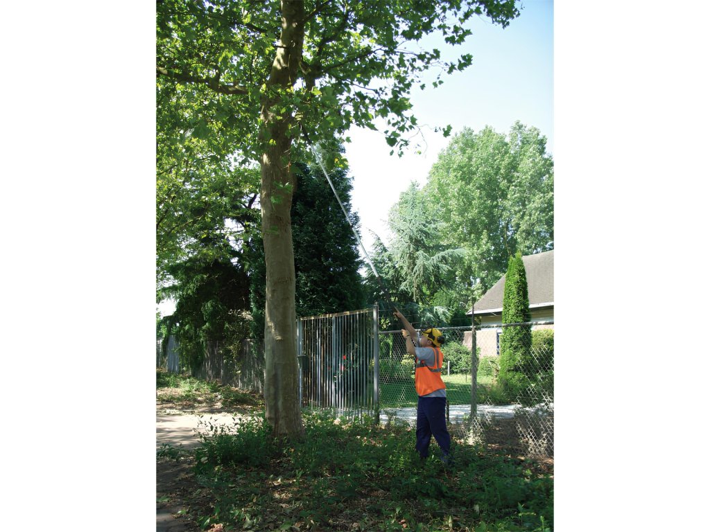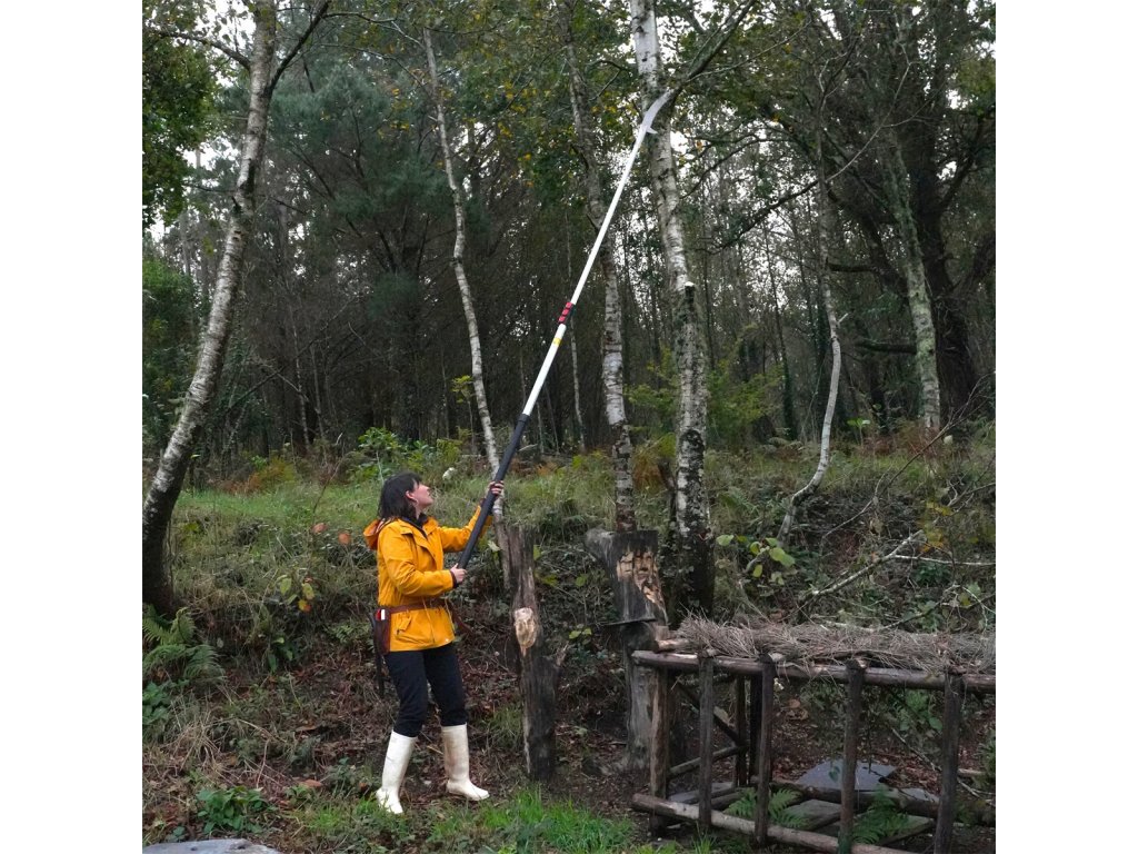 Hliníková násada má oválný tvar, díky které máte velmi přesnou kontrolu nad směrem řezu, což budete potřebovat při prořezávání ve velké výšce. Navíc tento tvar poskytuje větší pevnost a tuhost po celé délce tyčové pily a minimalizuje ohýbání. Při plném rozložení násady pak pila dosahuje maximální délky 4,9 metru. Dva zajišťovací mechanismy (tlačítka a páky) společně vytvářejí nejbezpečnější a nejstabilnější zajištění preferované délky násady, přičemž nejnižší část je opatřena gumou rukojetí pro pohodlné a bezpečné uchopení i za mokra.