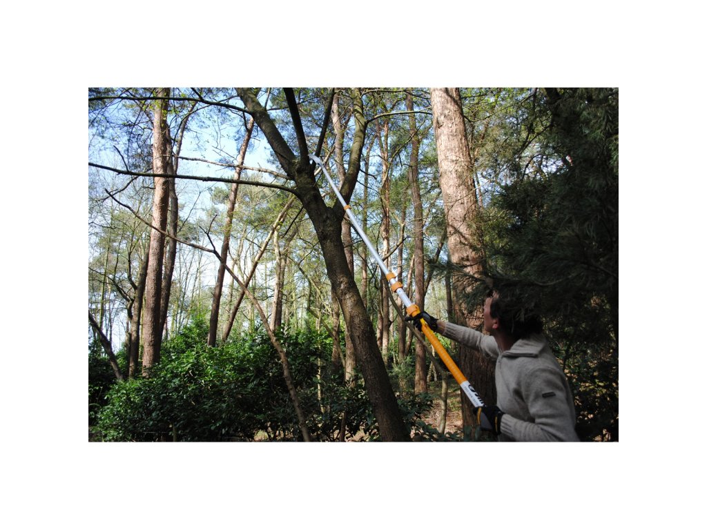 Hliníková násada má oválný tvar, díky které máte velmi přesnou kontrolu nad směrem řezu, což budete potřebovat při prořezávání ve velké výšce. Navíc tento tvar poskytuje větší pevnost a tuhost po celé délce tyčové pily a minimalizuje ohýbání. Při plném rozložení násady pak pila dosahuje maximální délky 3,6 metru. Dva zajišťovací mechanismy (tlačítka a páky) společně vytvářejí nejbezpečnější a nejstabilnější zajištění preferované délky násady, přičemž nejnižší část je opatřena gumou rukojetí pro pohodlné a bezpečné uchopení i za mokra.