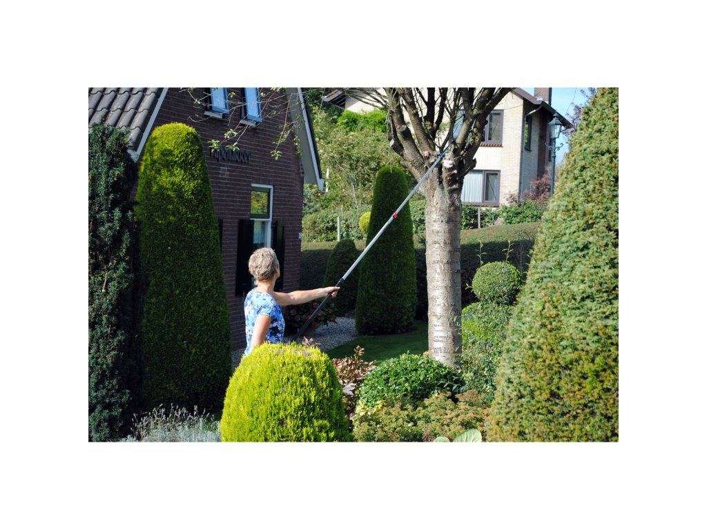 Hliníková násada má oválný tvar, díky které máte velmi přesnou kontrolu nad směrem řezu, což budete potřebovat při prořezávání ve velké výšce. Navíc tento tvar poskytuje větší pevnost a tuhost po celé délce tyčové pily a minimalizuje ohýbání. Při plném rozložení násady pak pila dosahuje maximální délky 3,3 metru. V kompletně složeném stavu má pila naopak pouhých 2 m, což oceníte při jejím transportu. Dva zajišťovací mechanismy (tlačítka a páky) společně vytvářejí nejbezpečnější a nejstabilnější zajištění preferované délky násady, přičemž nejnižší část je opatřena gumou rukojetí pro pohodlné a bezpečné uchopení i za mokra.